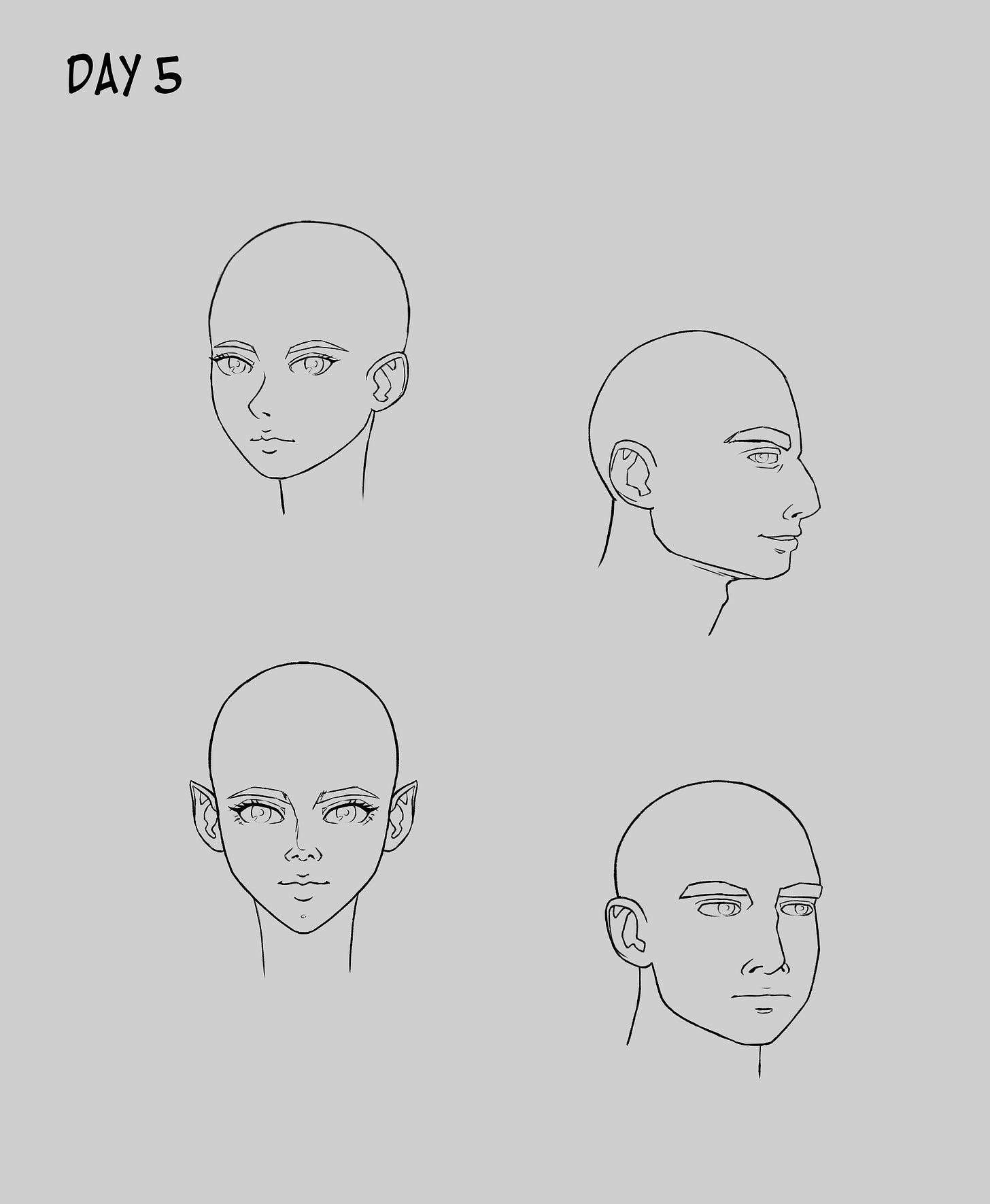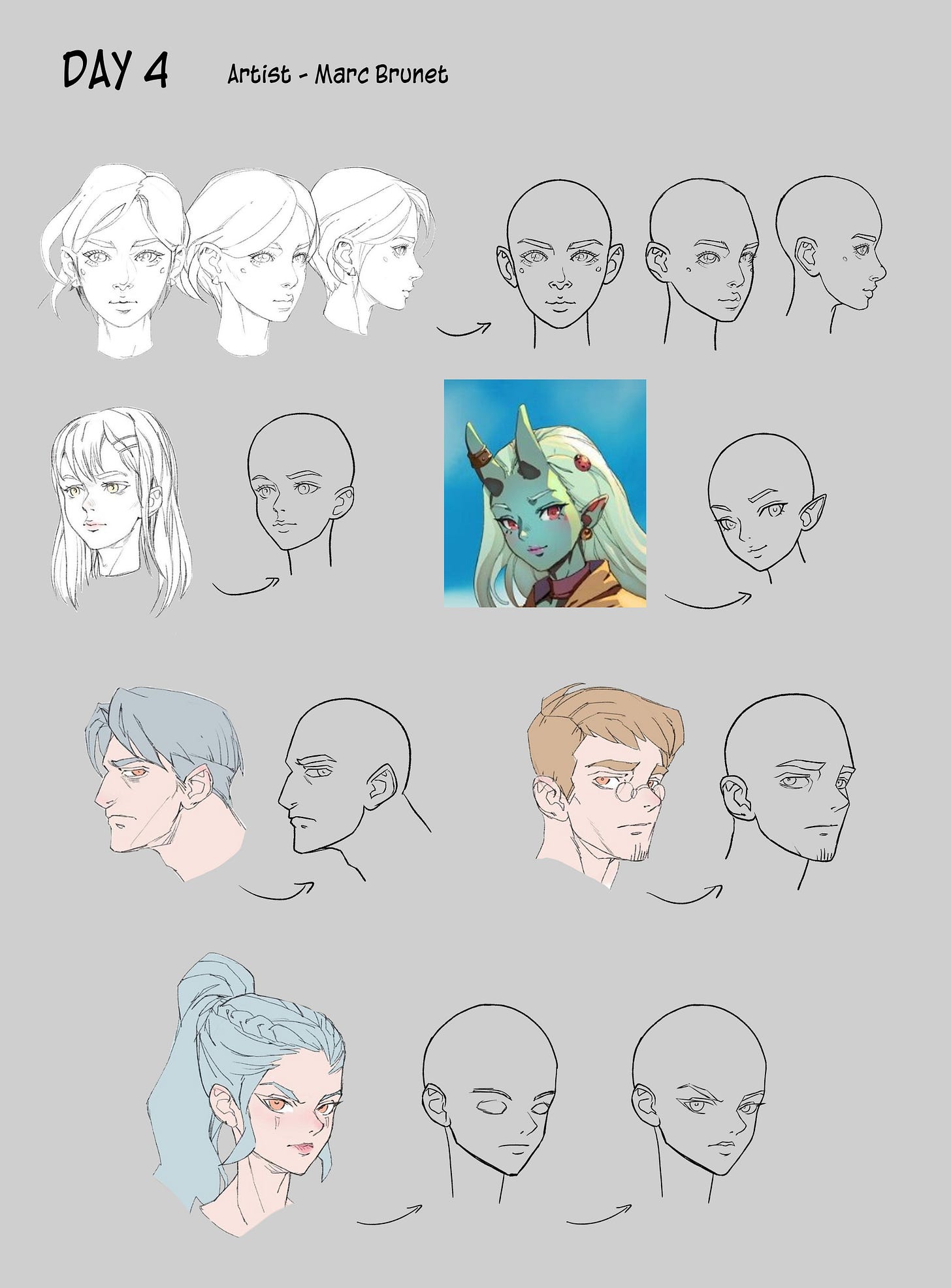 Our task is to draw several heads using the proportions we learned on the third day and complete them with facial features as on the fourth day. But this time do it from memory. Peeking is allowed only if we get completely confused 🫣 So let's keep character references from our chosen artist close (but not in front of us). Just in case 😉