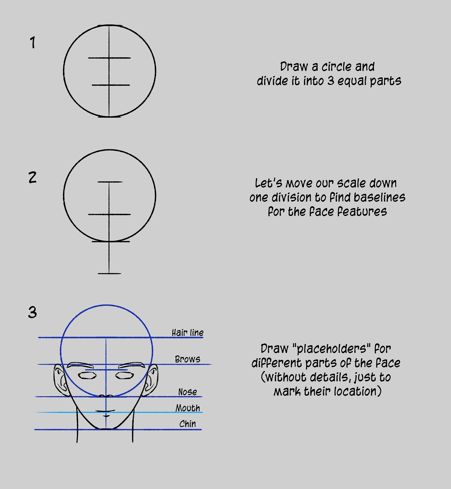 Practice drawing this scheme (it's a simplified Loomis method) until you remember how it is built, and you can draw everything by yourself without peeking. 2-3-6 times. As much as you need.