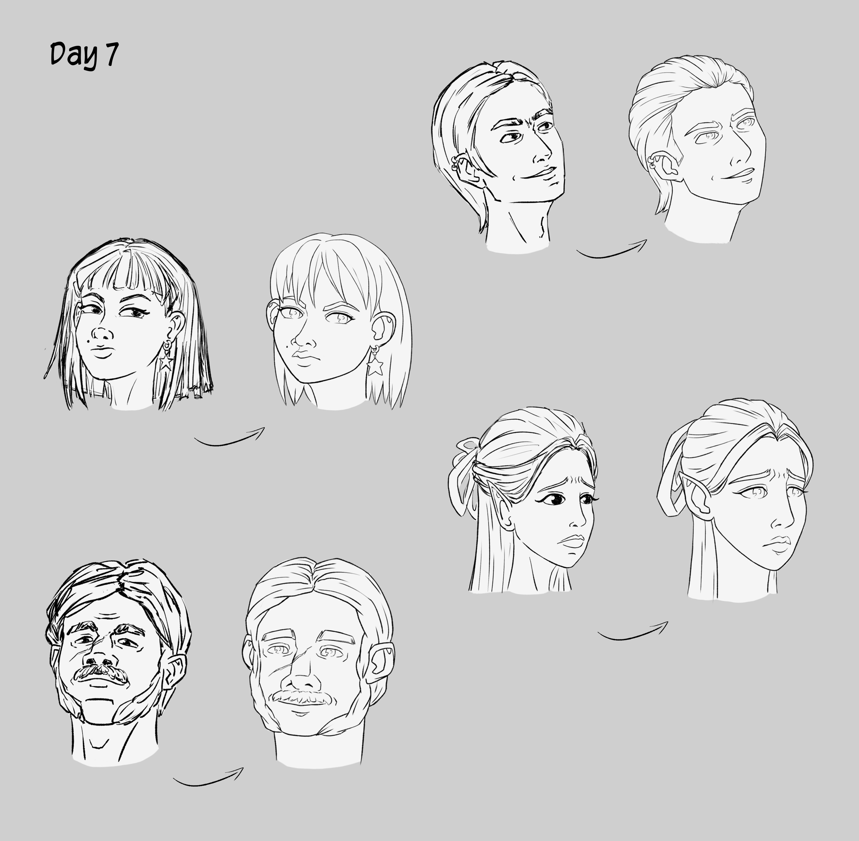 Do you remember the portraits from the first day? The ones we drew from the top of our heads as best we could? It's time to apply all the knowledge gained and redraw them 🤩 This time, no peeking and no cheating. Completely by yourself.