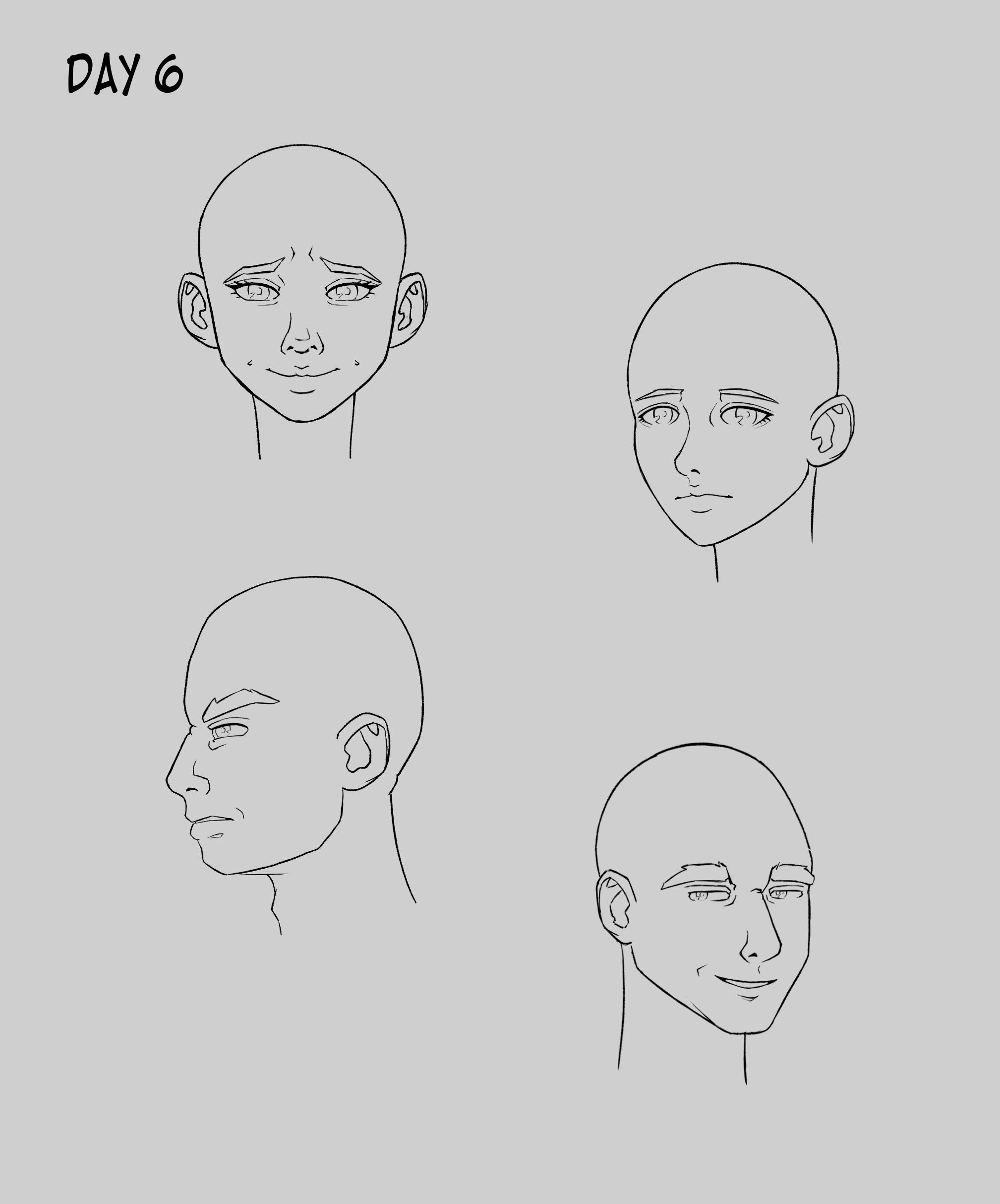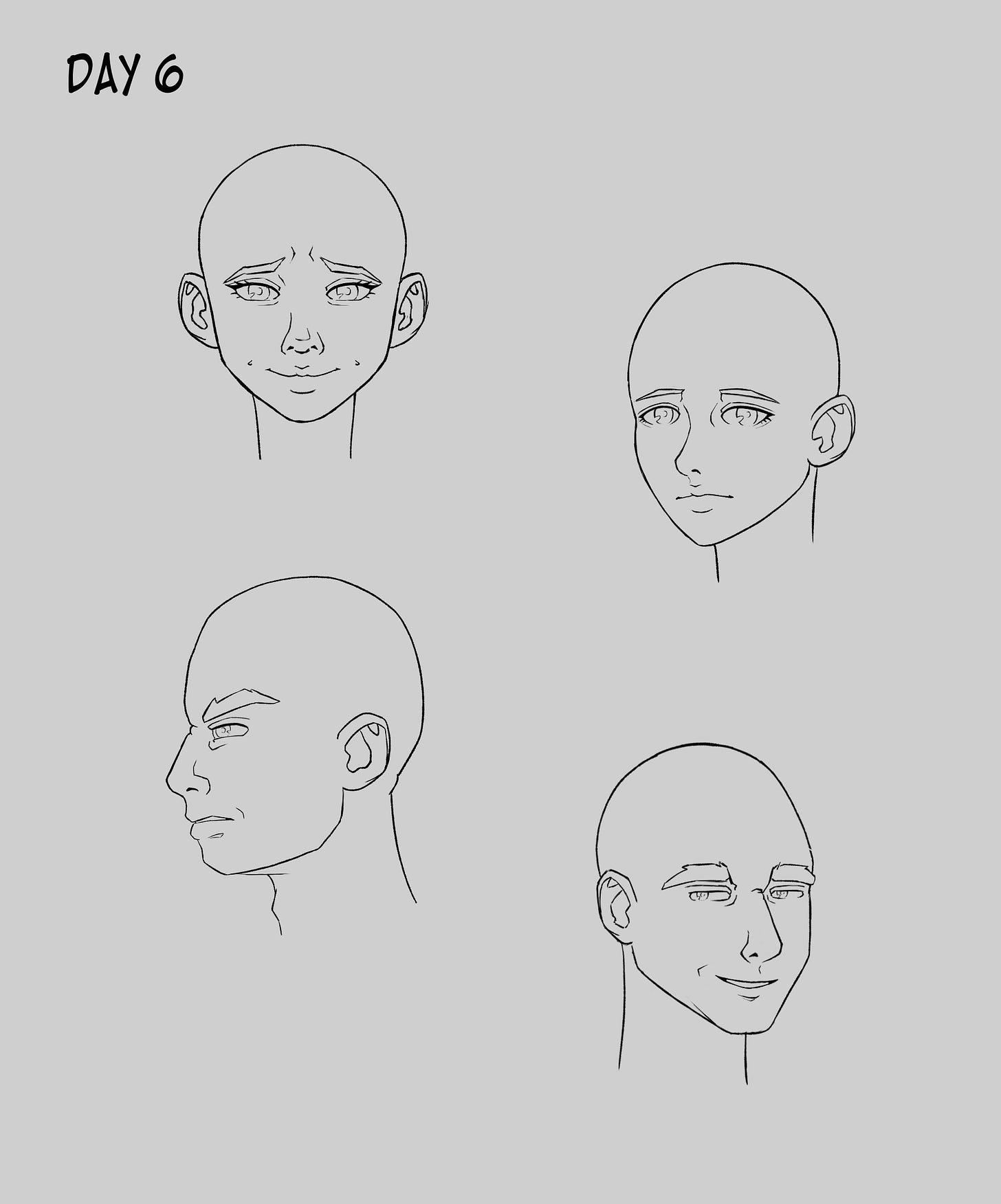 The task for today is almost the same as for the fifth day - we draw several heads, using the already studied proportions and stylization of facial features. But this time we will try to add a little emotion 😉 Shifted eyebrows, a smile, a different eye direction... The main thing is to not overdo it. Too extreme emotions often deform the shape of the face and this greatly complicates the learning.